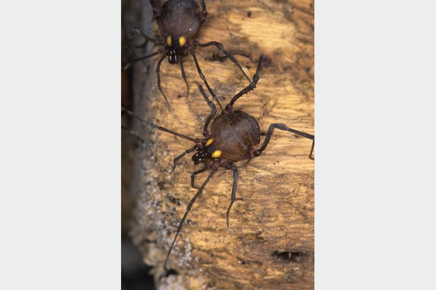 grandes que las hembras, con espinas muy conspicuas en el último par de patas. Su cuerpo es castaño, con dos manchas amarillas cerca de la zona de los ojos. Son solitarios. Durante el día se refugian debajo de piedras, troncos o restos de materiales en construcción. Durante la noche se dispersan para alimentarse y reproducirse. Cuando son atacados segregan sustancias repugnatorias de olor muy intenso, que hace recordar a la acetona, y de coloración opalescente.