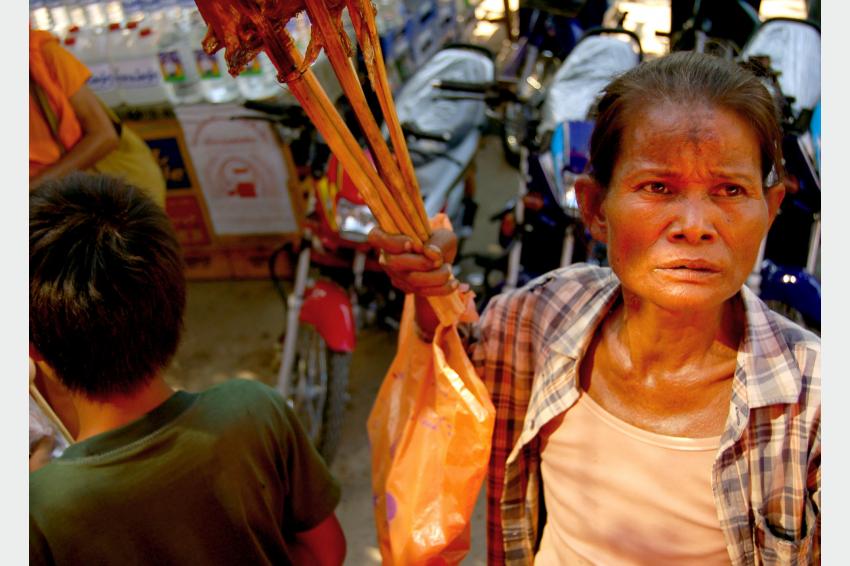Un grupo de mujeres y niños esperan largas horas en la parada del pueblo la llegada del ómnibus para venderle a los pasajeros brochetas de aves, huevos duros, ensopados embolsados o frutos de loto. La venta ambulante de comida, la búsqueda de un ingreso vendiendo comida para comprar más comida.