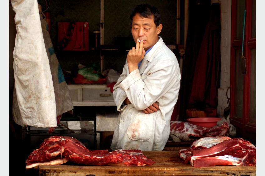 El carnicero aprovecha una pausa para fumar. En china se fuma mucho y se convive con el cigarro en cualquier espacio, ya sea público o privado, cerrado o abierto.