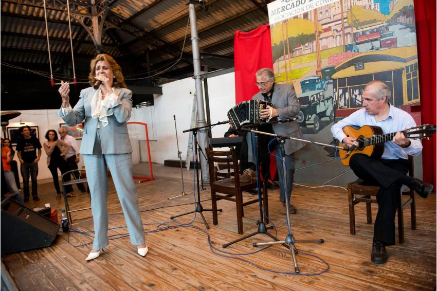 De izquierda a derecha: Olga Delgrossi, Raúl Jaurena, Ledo Urrutia. Festejos de los 5 años de la Escuela de Tango Destaoriya. Mercado de la Abundancia. 25 de noviembre de 2012. (Foto: 35604FMCMA.CMDF.IMM.UY - Autor: Carlos Contrera/CdF).