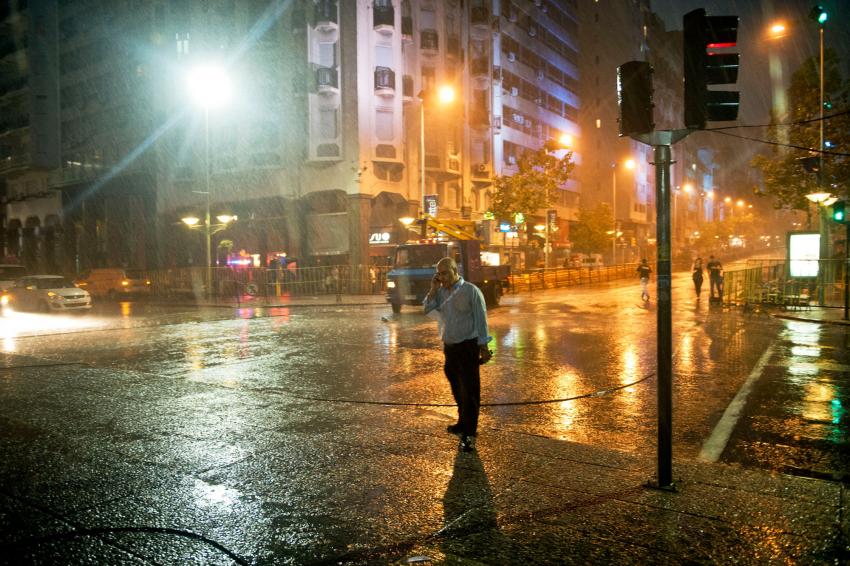 Suspensión del Desfile inaugural de Carnaval por la lluvia. Avenida 18 de Julio. Centro de Montevideo. Al centro: Fernando González, Gerente de Eventos de la Intendencia de Montevideo. 24 de enero de 2013. (Foto: 37355FMCMA.CMDF.IMM.UY - Autor: Carlos Contrera/CdF).