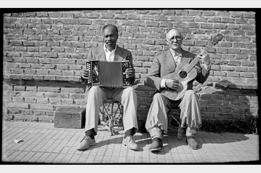 De izquierda a derecha Ercilio Querois (acordeón de dos hileras) y Diego Bordón López (guitarra). Carmen, departamento de Durazno. 11 de setiembre de 1954. (Foto: Lauro Ayestarán).