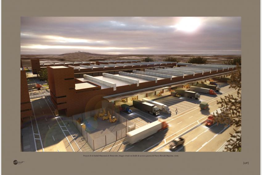 Proyecto de la Unidad Alimentaria de Montevideo. Imagen virtual con detalle de accesos a puestos del Nuevo Mercado Mayorista. (UAM)