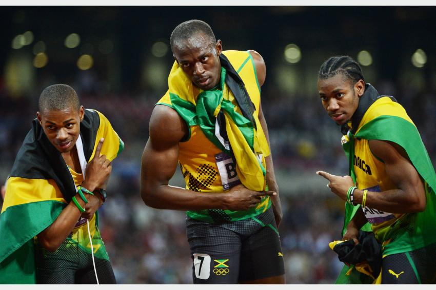 Warren Weir, Usain Bolt y Yohan Blake, de Jamaica, medallistas de bronce, oro y plata respectivamente, luego de la carrera final de 200 metros libres. Pruebas de atletismo masculino durante los Juegos Olímpicos. Estadio Olímpico de Londres. 9 de agosto de 2012. AFP PHOTO / Olivier Morin
