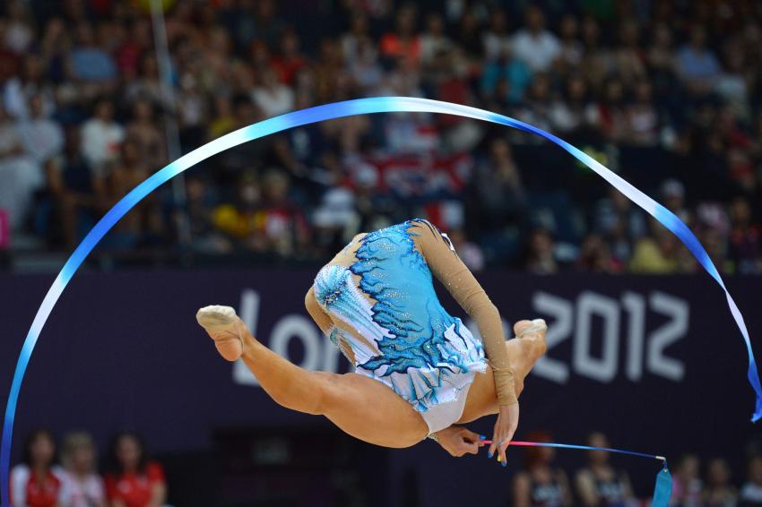 Chrystalleni Trikomiti, de Chipre, durante su rutina acrobática con cintas en la etapa de las calificaciones finales para las pruebas individuales de gimnasia olímpica. Juegos Olímpicos. Pabellón Olímpico de Wembley, Londres. 10 de agosto de 2012. AFP PHOTO / Ben Stansall