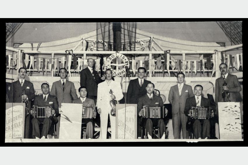 Orquesta Laurenz Casella. Baile de carnaval, teatro Solís. Año 1943. (Foto: Museo y Centro de Documentación Agadu)